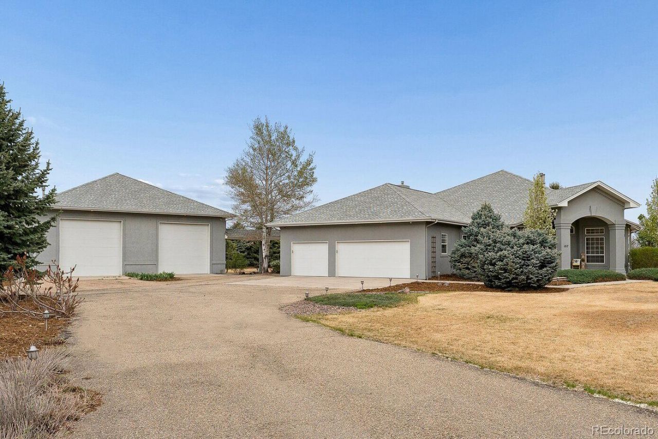 Welcome to this stunning CUSTOM ranch-style home in the highly sought-after Mulligan Lake Estates. Car enthusiast? RV Traveler? All Around Tinkerer? OVER $260,000 invested in 35 x 50 DETACHED SHOP with DRIVE THRU 12 x 12 Overhead Doors with Openers, 220v Service, and Gas HEAT awaits... Nestled in a serene cul-de-sac setting with access to a private lake, this beautifully maintained 1.37-acre property offers a peaceful retreat with mature trees and abundant privacy and VIEWS! Step inside to discover an open floor plan featuring high vaulted ceilings and gorgeous wood floors throughout the main living area. With 4 bedrooms, 3.5 baths and a perfect work-from-home office, this home fits a lot of people beautifully. Many UPDATES including high-end light fixtures, a fully remodeled primary bath, and a gourmet kitchen. Fully finished basement with 1 bedroom, a craft room, fully bath, rec room, and PLENTY OF STORAGE. The community has a private lake for fishing and paddle boating (no motorized boats) and walking trails. A great feel of small town living with the convenience to everything the front range has to offer. Conveniently located minutes from I-25, 15 minutes to Longmont, and 20 minutes to Loveland, this move-in-ready home combines luxury, comfort, and convenience in a serene setting. This is a beautiful house in a great location - come check it out! Did I mention the MASSIVE Detached RV/Garage/Workshop?