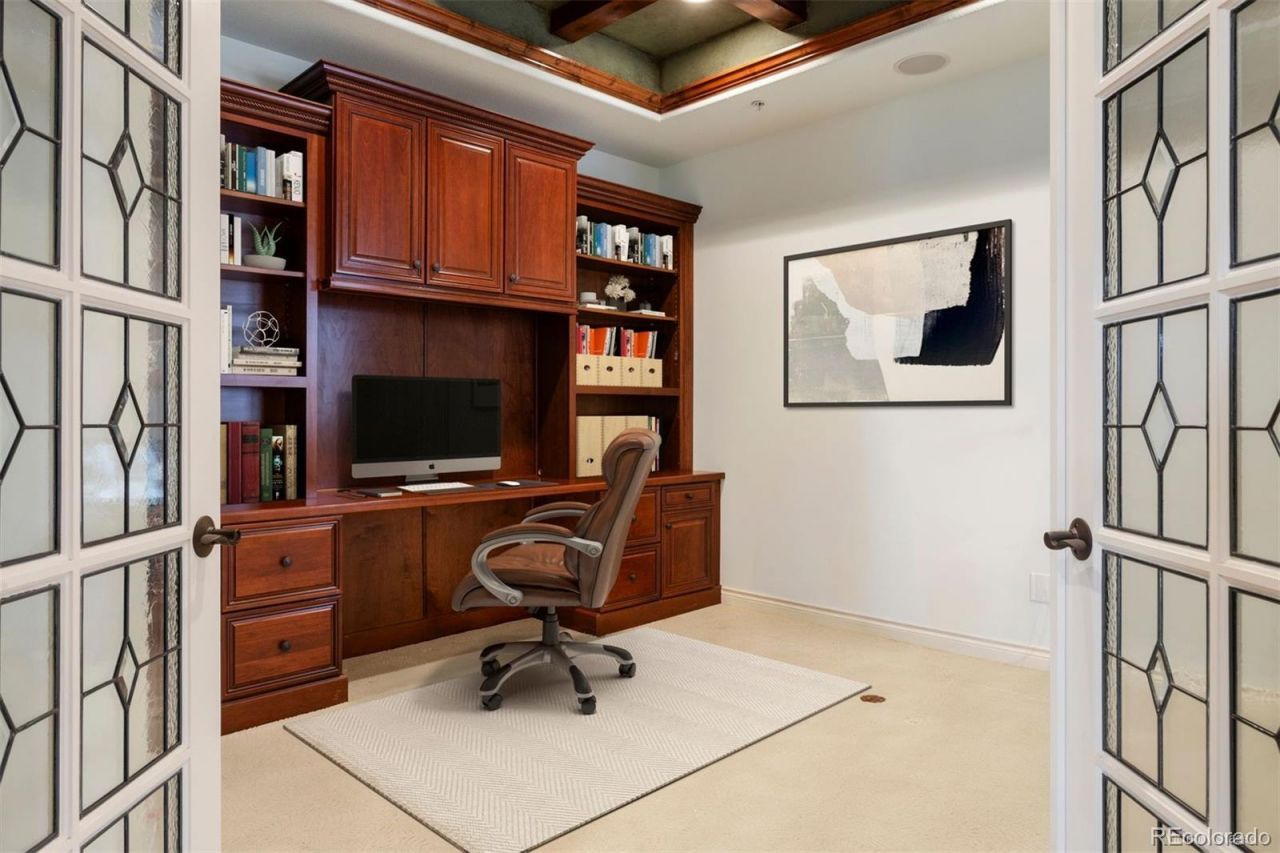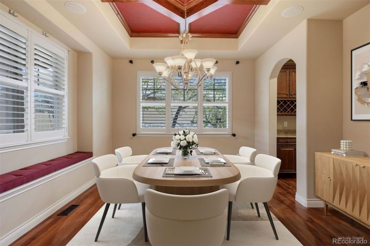 Welcome to this charming attached patio home in The Village at Castle Pines, ideally located directly across from the communitys adult recreation center and just steps from scenic walking trails. A quaint front porch sets the tone as you enter the home, where warm hardwood floors flow throughout creating an inviting atmosphere. Just off the entry, a private main-floor office features a built-in desk and bookshelves?perfect for working from home. The formal dining room offers a lovely window seat overlooking the front patio and yard, providing a comfortable space for everyday meals or gatherings. The great room is anchored by a stone gas fireplace and opens to the kitchen, creating an easy flow for daily living and entertaining. The kitchen includes cherry cabinetry, granite countertops, high end appliances, and a convenient Butlers pantry with wine storage connecting to the dining room. The main-floor primary suite provides direct access to the back deck and a peaceful setting among mature pine trees with a peek-a-boo view of The Rock. The en suite bath includes dual sinks, a soaking tub, glass enclosed shower, and generous closet space. A powder room and laundry room with ample cabinetry complete the main level. The walk-out lower level features a spacious family or recreation room with high ceilings, a second gas fireplace, wet bar, two additional bedrooms, and a large unfinished storage area?ideal for seasonal items or hobbies. The attached two-car garage is a standout feature, offering an overhead gas heater, epoxy-coated floors, extensive built-in cabinetry for added organization and functionality. Enjoy outdoor living on the expansive back deck?one of the largest on the street?complete with retractable awning and sunshades for added comfort and privacy.