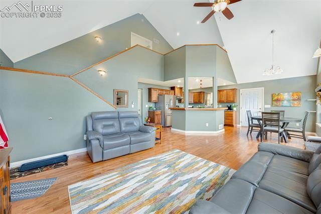 Wake up to breathtaking sunrises over the Colorado plains and mountains from this custom-built, single-owner masterpiece with full lake views. Perfectly positioned on a quiet cul-de-sac, this meticulously maintained home sits on lots 26 & 27 — over 1.6 acres of privacy, nature, and tranquility. Soaring high ceilings and an open-concept layout frame stunning lake and mountain vistas through every window. Hardwood floors flow throughout the main level, anchored by a stone gas fireplace. The chef's kitchen features top-end appliances, gas stove/oven, and washer/dryer included. The expansive primary suite occupies the entire second floor with an adjacent loft and walk-out balcony overlooking the mountains. Two oversized guest rooms and a well-appointed bath complete the main floor. The unfinished basement offers endless potential — rec room or additional living quarters. Step outside to a partially covered wrap-around deck — ideal for outdoor dining and lakeside living. Mudroom entry leads directly to laundry. Attached 2-car garage with storage plus a detached 1-car garage. Community amenities: pool, rec center, lake trail, and library nearby. Natural gas. Community water. New roof & gutters 2025. Just 27 minutes to Pueblo. Water, wildlife, and wide-open skies await.