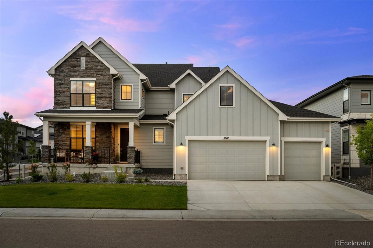 Step into luxury with this brand-new 5-bedroom, 5-bath home in Parker, Colorado. Built in 2023 on a spacious corner lot, it blends modern elegance with everyday functionality. Inside, a grand foyer with a drop zone leads to soaring ceilings, sleek contemporary railings, and a dramatic two-story great room centered around a stacked stone fireplace. The open layout flows into a chefs kitchen with high-end appliances, upgraded cabinetry, a large island, and a casual dining area that opens to a covered patio, perfect for year-round Colorado living. The master suite features a spa-like bath with dual vanities, soaking tub, glass-enclosed shower, and private water closet, plus a generous walk-in closet. A versatile loft and well-appointed secondary bedrooms with walk-ins ensure plenty of flexible living space. Additional highlights include upgraded lighting throughout, a main-floor office, a finished basement with two living areas, bedroom, and bath, plus a 5-car, epoxy coated garage. Outside, you will appreciate low maintenance, professional landscaping with a gas plumbed fireplace and endless space for outdoor entertaining. Additional highlights include upgraded lighting throughout, a main-floor office, a finished basement with two living areas, bedroom, and bath, plus a 5-car, epoxy coated garage. Outside, enjoy quick access to Cherry Creek Trail, nearby parks, as well as accredited Leman Academy Charter school. For more photos and information visit, www.5615LomaVista.com
